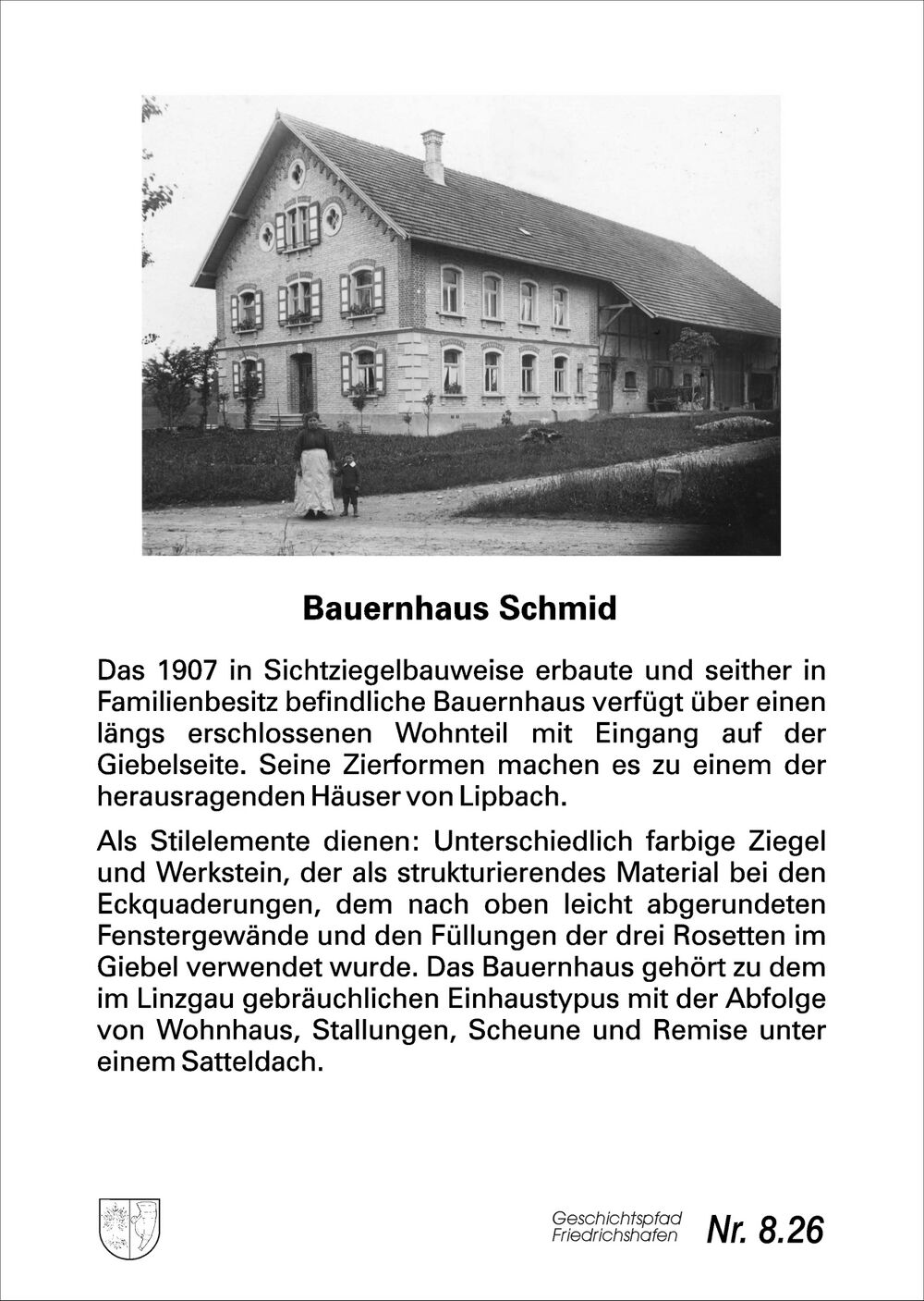 1906 zerstörte ein Großbrand drei Bauernhäuser samt Stallungen und Scheunen im nahe gelegenen Lorenzweg. Die Familie Schmid baute 1907 den Hof an dieser Stelle wieder auf. Es ist ein typischer Linzgau-Hof mit Wohnhaus, Stallungen, Scheune und Remise unter einem Satteldach. Das Besondere an diesem Haus ist allerdings die Giebelseite. Wie bei einem Stadthaus hat es hier seinen Haupteingang. Zahlreiche Verzierungen prägen diese Hausfront: Unterschiedlich farbige Ziegel geben Struktur, leicht nach oben abgerundete Fenstergewände und drei Rosetten im oberen Teil schmücken das Bauernhaus. Seine Zierformen machen es zu einem der herausragenden Häuser von Lipbach.