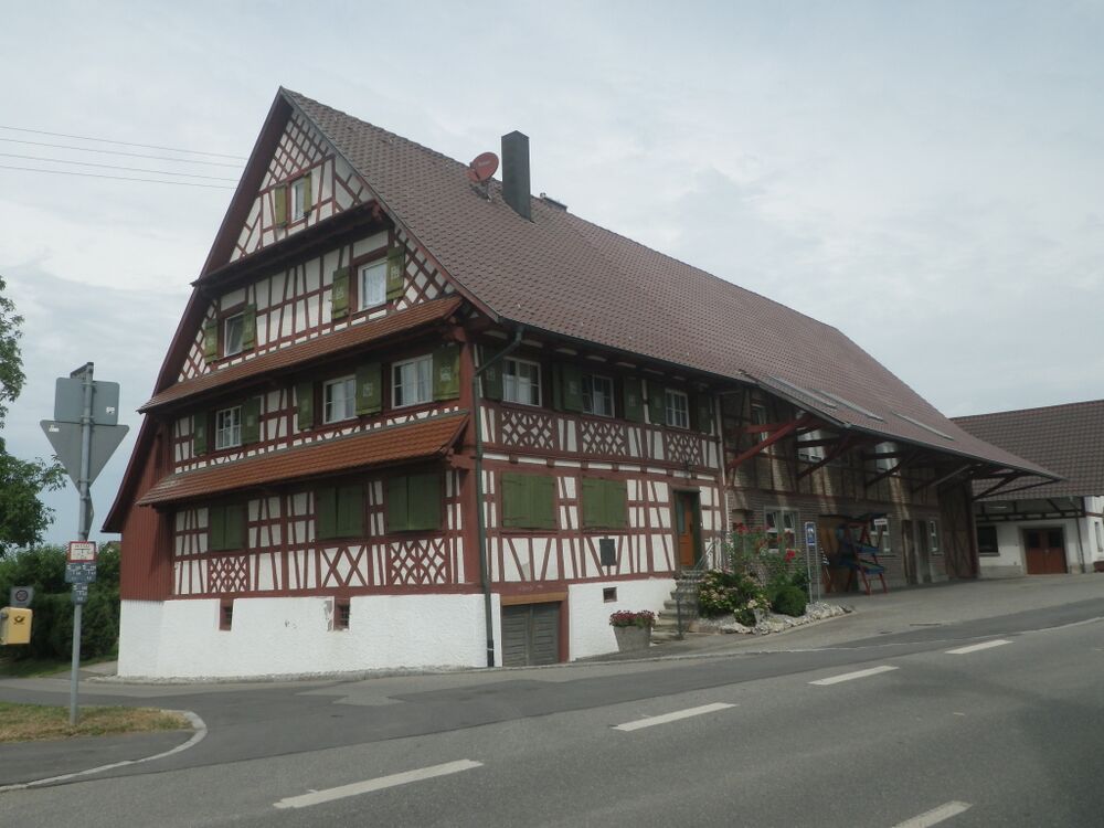 Das zweistöckige Fachwerkhaus wurde um 1700 im Linzgau-Stil erbaut und ist mit zahlreichen Zierformen wie Rauten, Andreaskreuzen und V-Streben ausgestattet.