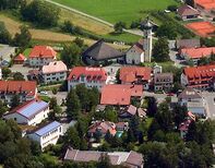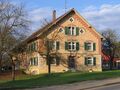 Um zwei interessante Objekte der Ortsgeschichte anzusteuern, gehen Geschichtsfreunde abweichend von den Rundweg-Schildern die Straße zwischen den Häusern hinunter bis zur Hauptstraße, überqueren diese und stehen vor einem denkmalgeschützten Bauernhof, dem Bauernhaus Schmid (5). 1906 zerstörte ein Großbrand drei Bauernhäuser samt Stallungen und Scheunen im nahe gelegenen Lorenzweg. Die Familie Schmid baute 1907 den Hof an dieser Stelle wieder auf. Es ist ein typischer Linzgau-Hof mit Wohnhaus, Stallungen, Scheune und Remise unter einem Satteldach. Das Besondere an diesem Haus ist allerdings die Giebelseite. Wie bei einem Stadthaus hat es hier seinen Haupteingang. Zahlreiche Verzierungen prägen diese Hausfront: Unterschiedlich farbige Ziegel geben Struktur, leicht nach oben abgerundete Fenstergewände und drei Rosetten im oberen Teil schmücken das Bauernhaus.