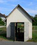 Der Orts-Rundweg führt hinter der Kirche in Richtung Riedheim an einem unscheinbaren Häuschen (links) vorbei: Es handelt sich hierbei um die Klufterner Viehwaage, die bis 2006 in Betrieb war.