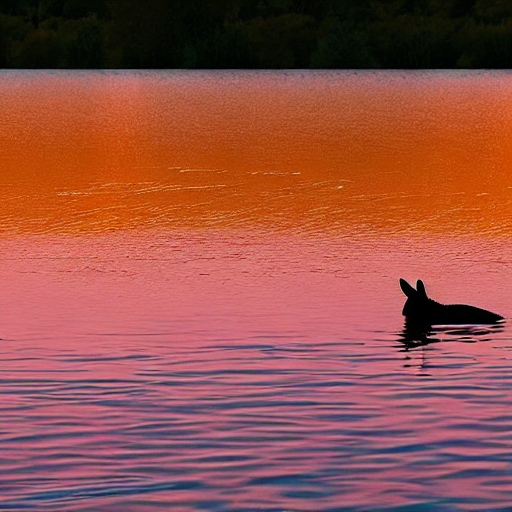 Prompt: Create a image that depicts a majestic lake rabbit at the shores of Lake Constance, with the sun setting dramatically in the background. The sky is painted in vibrant shades of orange, pink, and purple, reflecting in the calm waters of the lake. The lake rabbit emerges from the water, showcasing its unique shape and vibrant colors. The image should be vibrant, detailed, and breathtaking, capturing the beauty of nature and the splendor of Lake Constance.